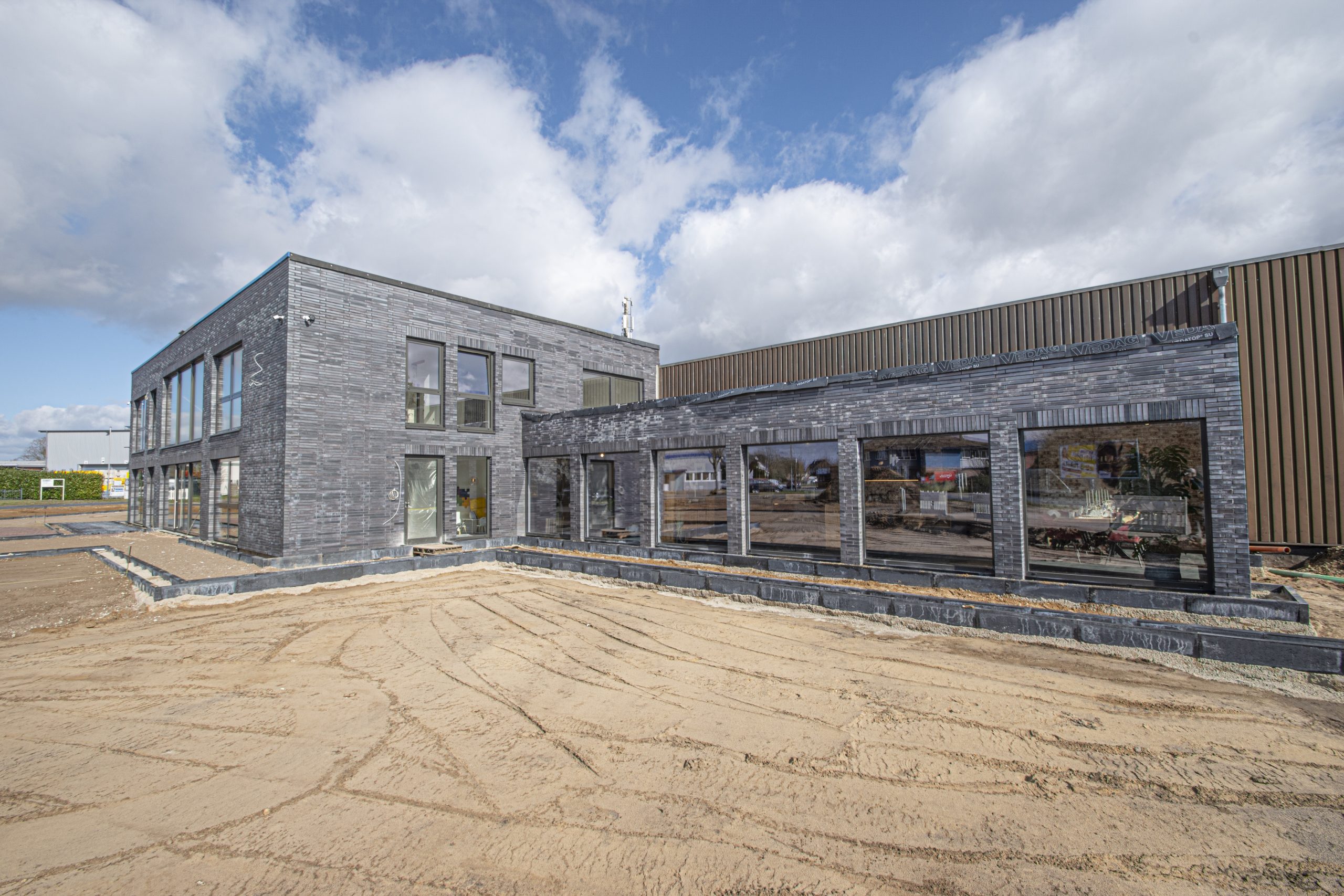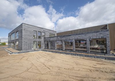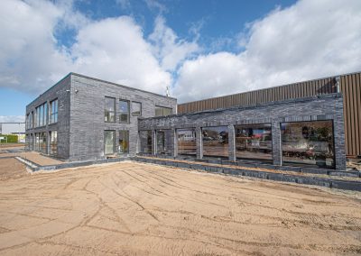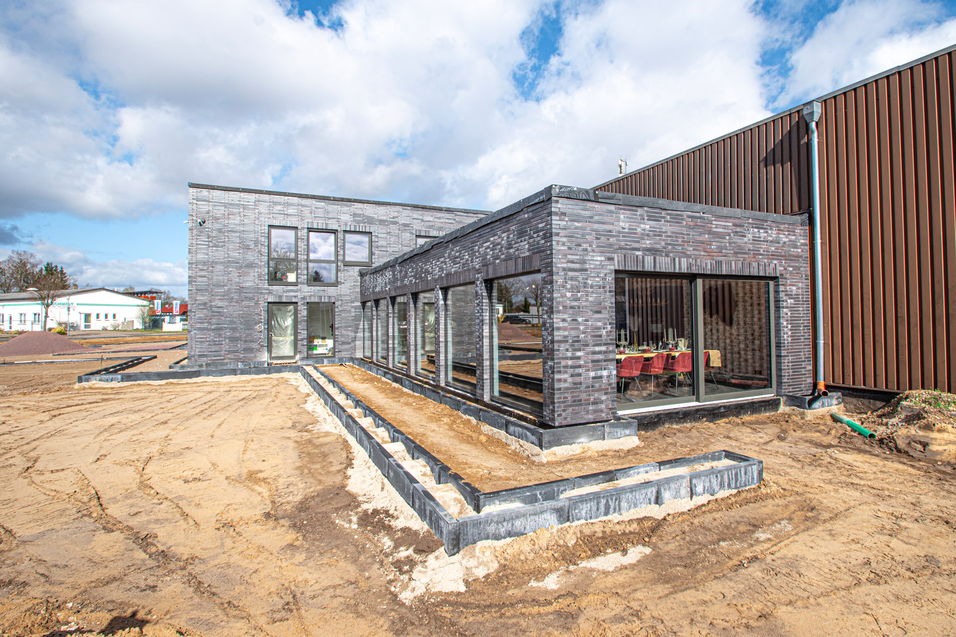 Hier seht ihr eine Vorschau, wie unser Küchenstudio im März 2024 aussah – mitten in der Bauphase. Zu diesem Zeitpunkt war vor allem der Außenbereich noch im Entstehen: Die Einfahrt war noch nicht fertiggestellt, Parkflächen fehlten, und rund um das Gebäude herrschte noch echte Baustellenatmosphäre.